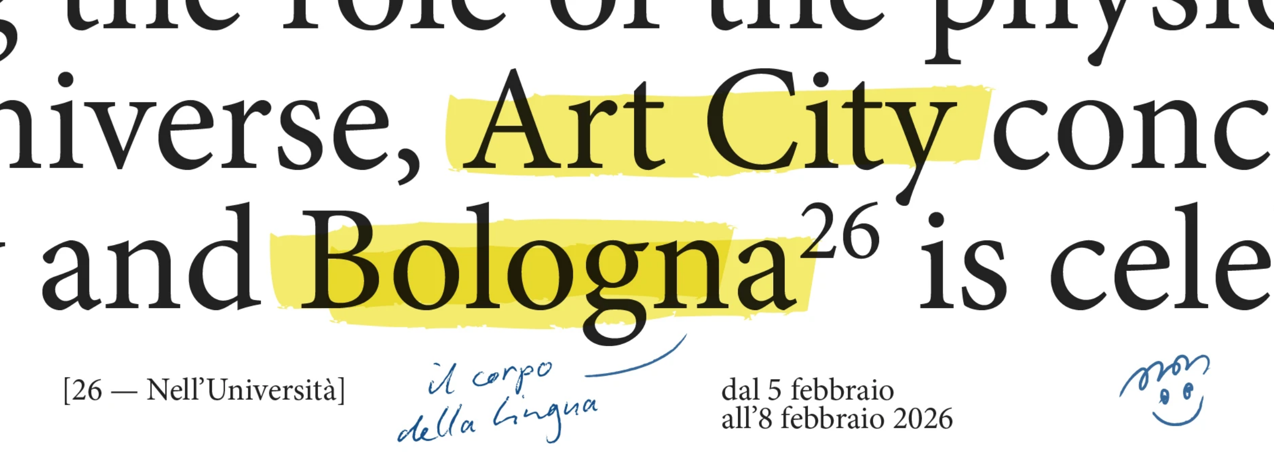 Dal 5 all’8 febbraio 2026 torna, per la quattordicesima edizione, ART CITY Bologna, il programma di mostre ed eventi promosso dal Comune di Bologna, con il sostegno di BolognaFiere in occasione di Arte Fiera, con la direzione artistica di Lorenzo Balbi, direttore del MAMbo – Museo d’Arte Moderna di Bologna del Settore Musei Civici del Comune di Bologna.